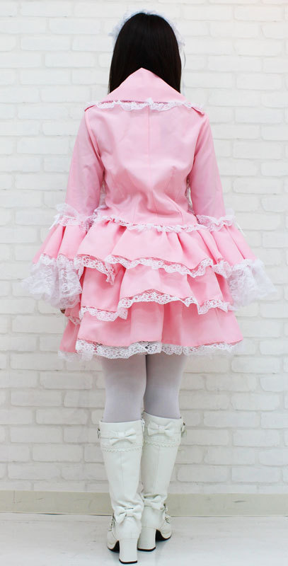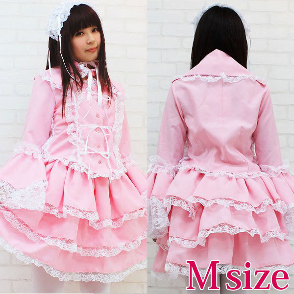 仕様:Mサイズ:B〜94cm・W62〜106cm 丈:上着48cm(袖丈62cm・肩幅38cm)・スカート48cm 付け襟(首回り)40cm セット内容:上着(前ボタン)・スカート(ウエスト部分ゴム、スカート3枚仕立て、裏地付き、チュールパニエ付き)・付け衿(ボタンにて着脱可)・ヘッドドレス