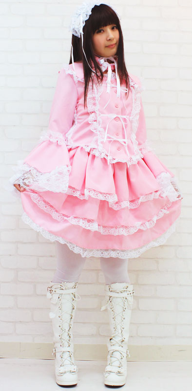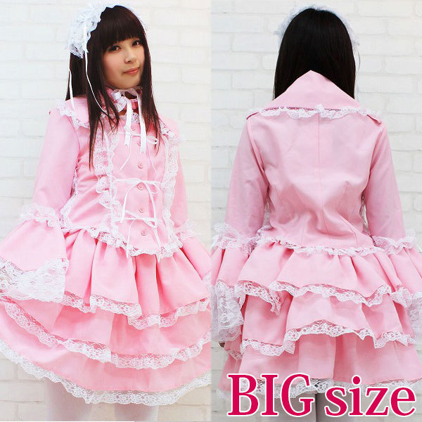 仕様:BIGサイズ:B〜100cm・W72〜120cm 丈:上着52cm(袖丈65cm・肩幅40cm)・スカート49cm 付け襟(首回り)43cm セット内容:上着(前ボタン)・スカート(ウエスト部分ゴム、スカート3枚仕立て、裏地付き、チュールパニエ付き)・付け衿(ボタンにて着脱可)・ヘッドドレス