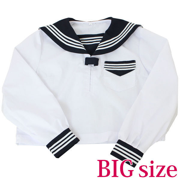 定番コスプレを自分流にアレンジ!オールシーズン使える中間服タイプの長袖セーラーブラウス単品(BIG)。襟や袖、胸ポケットに入った白の3本ラインがオシャレ!一着は持っておきたい定番のセーラー服コスプレです。お気に入りのスカートや、お手持ちのスカーフとあわせて可愛く着こなしてください!※水洗い不可、塩素系漂白剤による漂白不可、アイロンは中温で当て布使用、ドライクリーニング可、色落ちの可能性があります。※こちらの商品は在庫の状況によりお届けまでに4日〜7日程度かかる場合がございます。