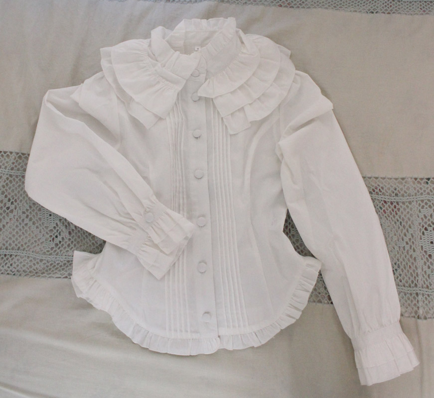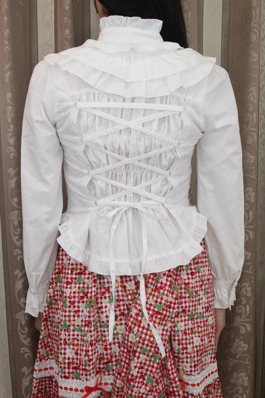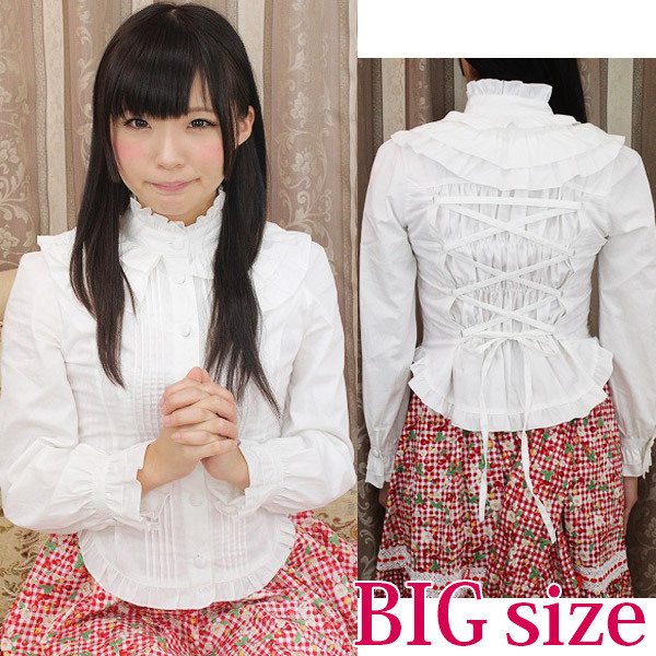 お姫様気分が盛り上がるたっぷりフリル!クラシカルな世界観を楽しめる純白ブラウス単品(BIG)。立襟のフリルがとっても可愛く、肌触りが良いので着心地も良好!バックはシャーリング入りの編み上げになっており、ゴスロリやコスプレ衣装とも相性抜群!一枚は持っておきたいキュートなブラウスです。※水洗い不可、塩素系漂白剤による漂白不可、アイロンは中温で当て布使用、ドライクリーニング可、色落ちの可能性があります。※こちらの商品は在庫の状況によりお届けまでに4日〜7日程度かかる場合がございます。