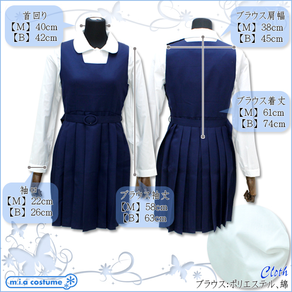 仕様:Mサイズ:B〜88cm・W〜76cm ブラウス(着丈61cm・肩幅38cm・袖丈58cm・袖口22cm・首回り40cm) ジャケット(着丈52cm・肩幅41cm・袖丈54cm) ジャンパースカート(総丈87cm) セット内容:ジャケット、丸襟ブラウス、ジャンパースカート、ベルト