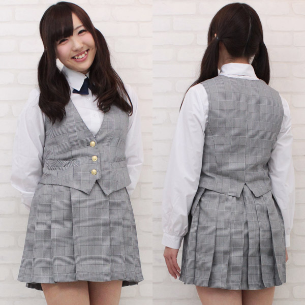 優等生気分が味わえる、金ボタン付きのベストがポイント!グレーのチェック柄が清楚なお嬢様風制服コスプレ(M)。シャツ、スカート、リボンにベストがセットになった、お洒落な中間服タイプの制服コスチュームです。※水洗い不可、塩素系漂白剤による漂白不可、アイロンは中温で当て布使用、ドライクリーニング可、*色落ちの可能性があります。
