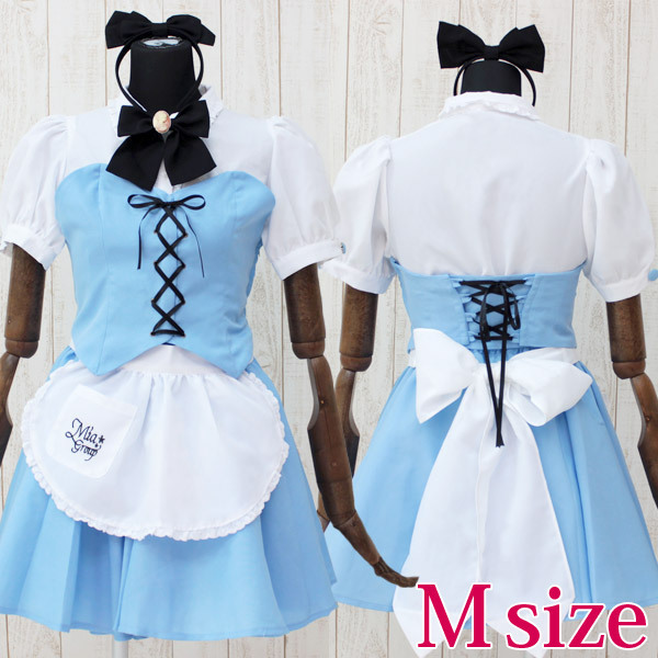 ブローチ付きの黒リボンがアクセント!メイド喫茶のオフィシャル制服に、アリス風の水色メイド服が登場しました。キュートなパフ袖に丸エプロンで可愛さ満点!ペチコートやリボンカチューシャなど、小物も充実した豪華7点セットのコスプレ衣装です。※水洗い不可、塩素系漂白剤による漂白不可、アイロンは中温で当て布使用、ドライクリーニング可、色落ちの可能性があります、ご注意ください。※ブラウス:前ボタン留め、立て襟、襟繰りレース付、胸部にビスチェ固定用のスナップ付、袖に水色くるみボタン付き※ビスチェ:横ファスナー、内側にシャツ固定用のスナップ付、背中の編み上げによりウェスト部のサイズ調整可※エプロン:ポケット付き、裾レース付、ミアグループロゴ刺繍入り※スカート:ウェストゴム仕様、全円スカート※ペチコート:裾レース付、ウェストゴム仕様、全円スカート※リボンカチューシャ:ブローチ付きリボンと共布※ブローチ付きリボン:安全ピン付、ブローチ付き※こちらの商品は在庫の状況によりお届けまでに4日〜7日程度かかる場合がございます。
