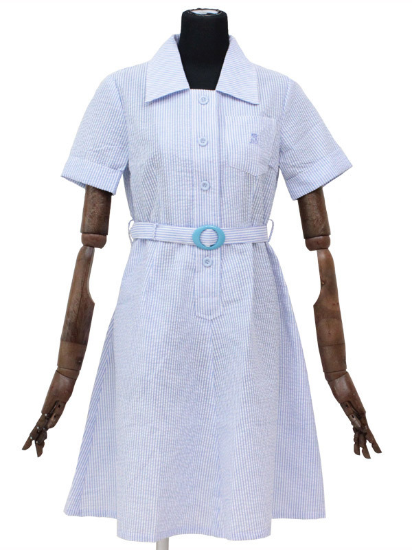 水色と白のストライプ柄がとっても涼しげな盛夏服タイプの制服コスプレ(M)。●ワンピースは前ボタンで一人でも簡単に着脱OK●ベルト付き(長さ調節可)●胸当てスナップボタン付き●スカートポケットあり。胸ポケットにさり気なく施された刺繍がオシャレ!お嬢様気分を味わえちゃう清楚な制服コスチュームです。※水洗い不可、塩素系漂白剤による漂白不可、アイロンは中温で当て布使用、ドライクリーニング可。※こちらの商品は在庫の状況により、お届けまでに4日〜7日程度かかる場合がございます。