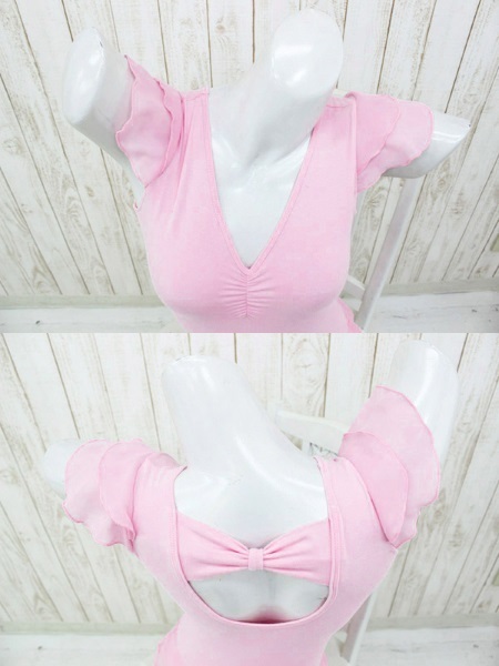 バレリーナ気分で華やかに♪可愛すぎて胸キュンしちゃうレオタードコスチューム。●ふんわり女性らしいパステルピンク●本格的な雰囲気のバレエレオタード●二段フリル付きのひらひらスリーブ●デコルテが綺麗に映えるVネック●胸元に優しく寄り添うギャザー入り●大きく開いた背中にリボン飾り付き●花びらのように広がるミニスカート●裏地には一部当て布付き。白タイツとあわせたくなる本格的なバレエコスチューム!フリルやリボン使いなど乙女心をがっちり掴むロマンチックなデザインです。髪形はお団子ヘアーにして雰囲気をさらにアゲるのがおすすめ。※水洗い不可、塩素系漂白剤による漂白不可、アイロンは中温で当て布使用、ドライクリーニング可、色落ちの可能性があります、ご注意ください。