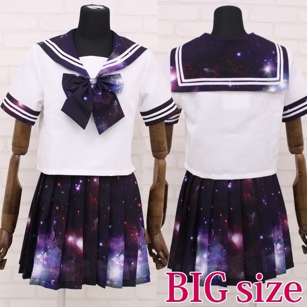 ロマンティックで幻想的な宇宙柄♪フォトプリントデザインのセーラー服コスプレ。●インパクト抜群の宇宙柄●オシャレで神秘的な紫カラー●セーラートップス&スカート●お揃い柄のリボンもセット。数多の星や銀河が美しい宇宙柄がプリントされたセーラー服コスチューム!黒や白のニーハイからハイソックスまで何でも合わせられます。※水洗い不可、塩素系漂白剤による漂白不可、アイロンは中温で当て布使用、ドライクリーニング可、色落ちの可能性があります、ご注意ください※本製品は、生地の裁断工程により柄の位置(模様)に個体差が生じます。