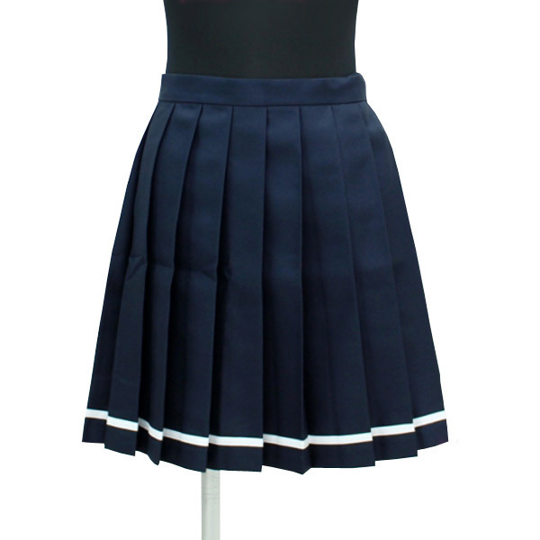 仕様:Mサイズ:W66〜72cm スカート丈45cm セット内容:スカート単品(横ファスナー、アジャスター調節可) 素材:ポリエストル100% 無地プリーツスカート単品 色:紺×白ライン