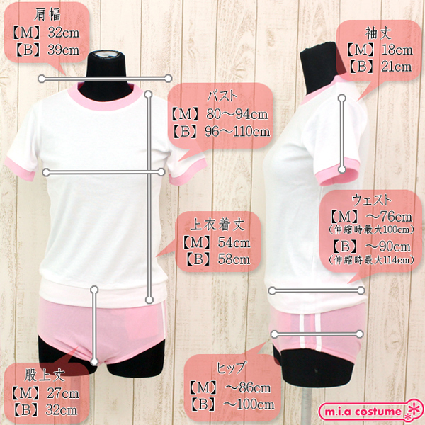 仕様:BIGサイズ B96〜110cm・W〜90cm(伸縮時最大114cm)・H〜100cm 上衣:着丈58cm・肩幅39cm・袖丈21cm ブルマ:股上丈32cm セット内容:上衣、ブルマ 素材:ポリエステル65%、コットン35%