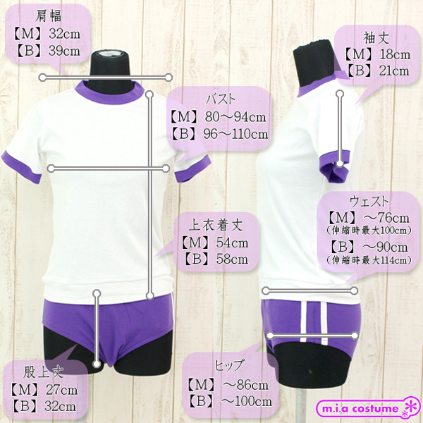 仕様:Mサイズ B80〜94cm・W〜76cm(伸縮時最大100cm)・H〜86cm 上衣:着丈54cm・肩幅32cm・袖丈18cm ブルマ:股上丈27cm セット内容:上衣、ブルマ 素材:ポリエステル65%、コットン35%