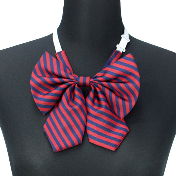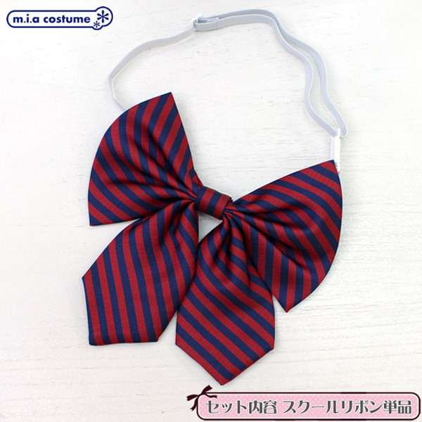 紺とエンジを組み合わせた大きめのストライプ柄のスクールリボン。留め具で身に着けるだけで装着簡単!ゴム紐は長さを調節出来るため、好みに合わせたサイズに変更していただけます。制服衣装のコスプレアイテムとしてはもちろん現役学生さんの制服小物にも最適!可愛らしさがアピールできるように、形にもしっかりこだわったスクールリボンです。※水洗い不可、塩素系漂白剤による漂白不可、アイロンは中温で当て布使用、ドライクリーニング可、色落ちの可能性があります。※こちらの商品は在庫の状況によりお届けまでに4日〜7日程度かかる場合がございます。