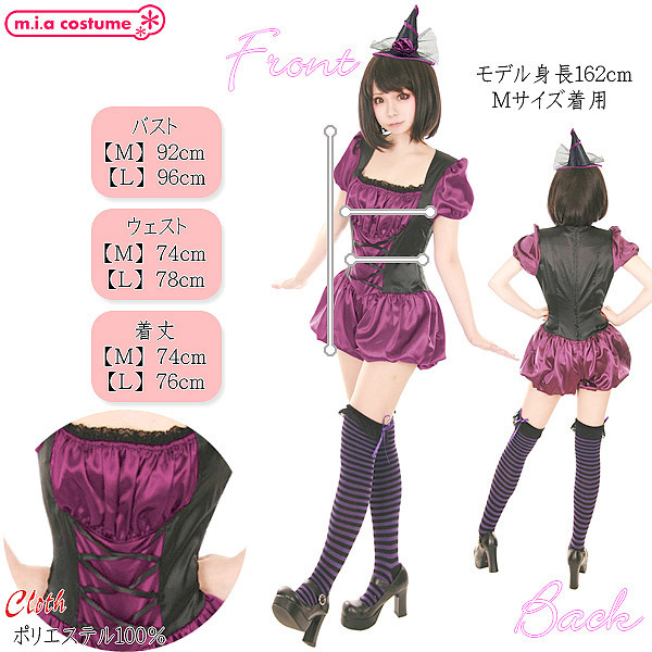 小さな三角帽子がチャーミング♪サテン風の艶やかな生地を使用した、黒×パープルのダークポップな可愛い魔女コスプレ。かぼちゃパンツデザインのサロペットが元気でキュートな魔女っ娘に演出!ハロウィンナイトにピッタリな可愛いコスプレです。※塩素系漂白剤による漂白不可、洗濯の際はリボンなどの付属品を外し個々単独での手洗いをお願いします、色落ちの可能性があります。※こちらの商品は在庫の状況によりお届けまでに4日〜7日程度かかる場合がございます。