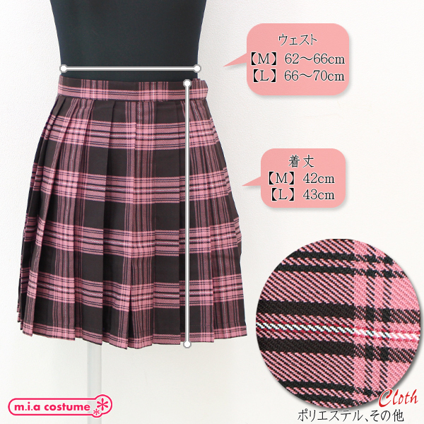 ピンク×ブラウンのカラーリングが可愛いチェック柄のプリーツスカート単品。横ファスナーを上げてアジャスター付きの留め具で引っ掛けるだけで手軽に着られる♪オリジナルの制服コスプレを楽しみたい時に◎小物が入れられるポケット付き。※水洗い不可、塩素系漂白剤による漂白不可、色落ちの可能性があります。※こちらの商品は在庫の状況によりお届けまでに4日〜7日程度かかる場合がございます。