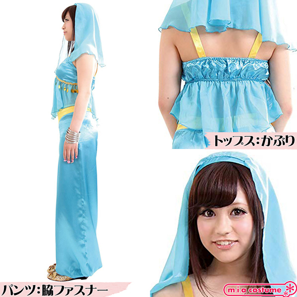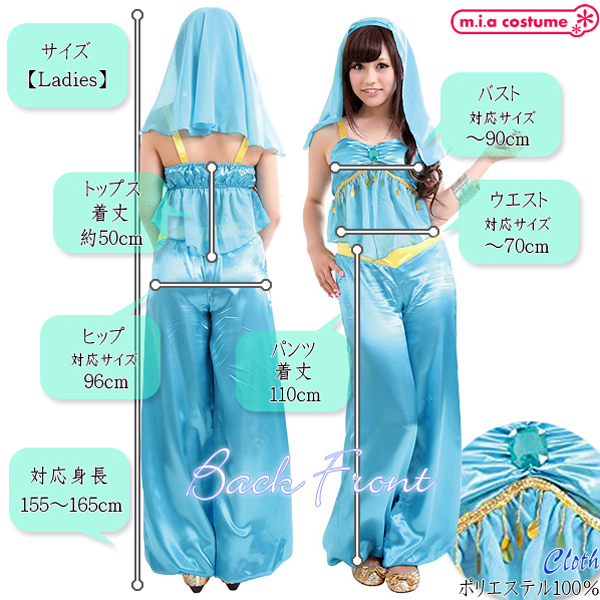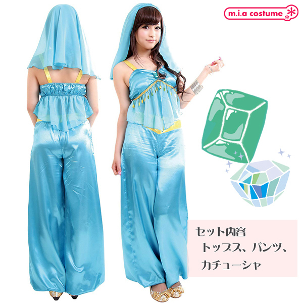 エメラルドカラーの艶やかなサテン地にイエローがアクセントになったアラビアン風コスチューム。エキゾチックな雰囲気が魅力的なハロウィン仮装♪腹部と背中側の生地に透け感はあるものの、絶妙な重ね具合で露出控えめに着用していただけます。世界的人気のヒロインになりきるも良し、新年会&忘年会の余興やベリーダンスなどのステージ衣装としても◎※塩素系漂白剤&水洗い不可※水洗い不可、塩素系漂白剤による漂白不可、アイロンは低温で当て布使用、石油系ドライクリーニング可、色落ちの可能性があります。※こちらの商品は在庫の状況によりお届けまでに4日〜7日程度かかる場合がございます。