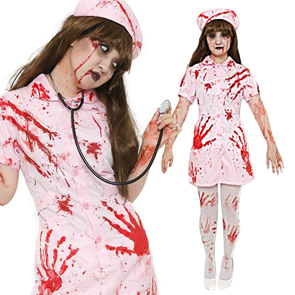ホラーメイクをすれば雰囲気マシマシ!血糊が付いたピンクカラーのナースコスプレ。ハロウィン大人気のゾンビなナースになりきろう♪ワンピース、ナースキャップ、血糊がセットになった3点セット。友達やパートナーと一緒に仮装してホラーナイトハロウィン!※水洗い不可、塩素系漂白剤による漂白不可、アイロンは中温で当て布使用、石油系ドライクリーニング可、色落ちの可能性があります。※こちらの商品は在庫の状況によりお届けまでに4日〜7日程度かかる場合がございます。