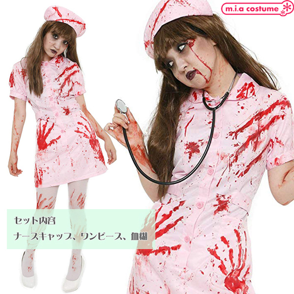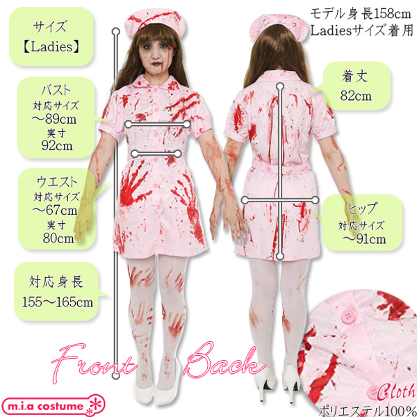 仕様:Ladiesサイズ:B〜89cm・W〜67cm・H〜91cm・身長155〜165cm・着丈82cm セット内容:ナースキャップ、ワンピース(前ボタン)、血糊 素材:ポリエステル100%
