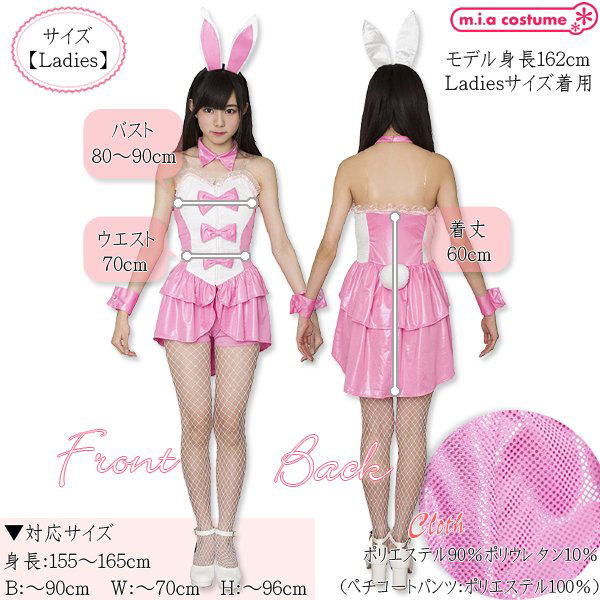 キラキラ光るスパンコールで華やかに♪ピンク×白で甘く可愛く仕上げたバニーガールコスプレ。大きめのリボンを3つフロントに飾ったワンピースに、ペチコートパンツや付襟、ウサ耳カチューシャなど小物含めて6点がセットになったお得なバニーガール衣装♪後ろの丸い尻尾とウサ耳を外せばアイドル衣装としても使用できます。Fサイズ※しっぽ等白い部分に衣装の色移りがある場合がございます※洗濯不可、塩素系漂白剤による漂白不可、アイロン不可、ドライクリーニング不可※こちらの商品は在庫の状況によりお届けまでに4日〜7日程度かかる場合がございます。