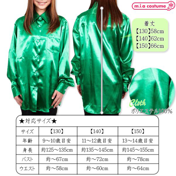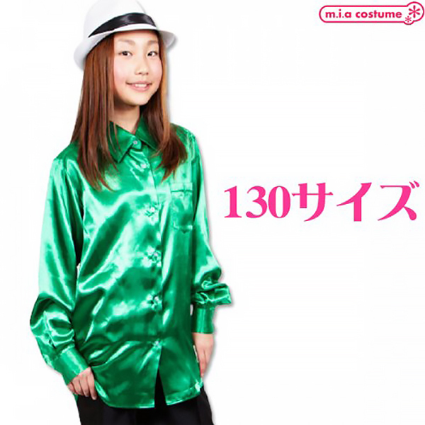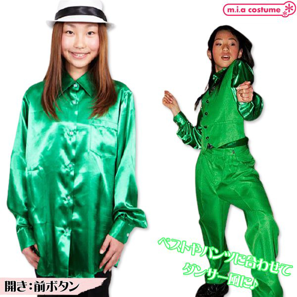 他とは違ったおしゃれな着こなしをしたいときに♪光沢のあるグリーンな蛍光色のサテンシャツです。サテンシャツはステージ映えするアイテムとして昔から多くのダンサーに愛用され続けてきました♪照明が当たったときの見栄えはコットン地のシャツとは違った表情を見せてくれ、ツルっとした質感なので着心地も良くて滑りやすいのでダンスにピッタリです。また、ダンス用以外にもステージ用、カラオケ用、合唱用など幅広いシーンで大活躍しそう♪様々なシーンで活躍してくれるので、是非一着はおさえておきたいアイテムです。こちらは130サイズです。※水洗い不可、塩素系漂白剤による漂白不可、アイロン不可、ドライクリーニング可
