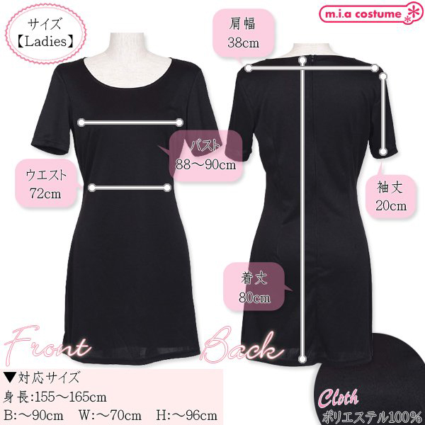 仕様:対応サイズ:身長155〜165cm・B〜90cm・W〜70cm・H〜96cm 実寸:B88〜90cm・W72cm・肩幅38cm・袖丈20cm・着丈80cm セット内容:ワンピース単品(背中心ファスナー) 素材:ポリエステル100% モデル身長155cm