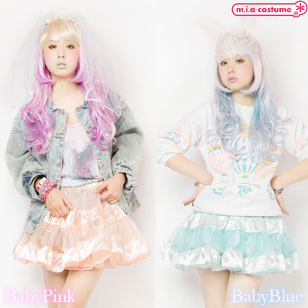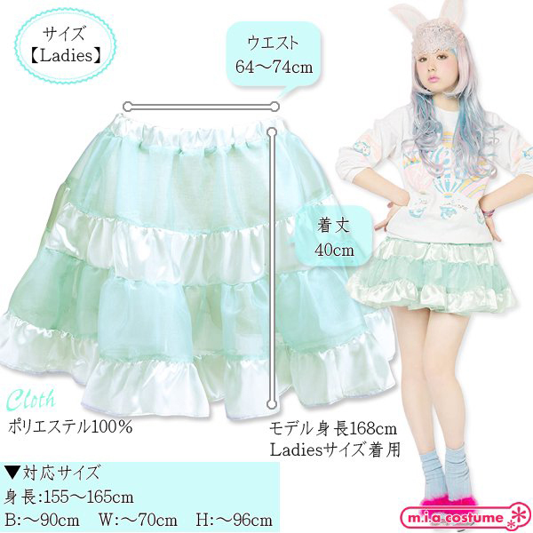 イベント用衣装やパーティーコスプレとしても良さげ♪原宿系カリスマモデル「AMO」がプロデュースする新ブランド「LUNATICLEMONYLOLLIPOP」からティアードスカート(ベビーブルー)が登場!サテンの光沢感とシースルー素材の組み合わせが可愛くて、重ねるボトムスで様々なコーディネイトが楽しめる逸品です。さわやかなベビーブルーが優しい印象を与えてくれて、ふんわり広がるガーリィなシルエットもポイントです。※洗濯機不可、弱い手洗い可、塩素系漂白剤による漂白不可、アイロンは中温で当て布使用、ドライクリーニング不可