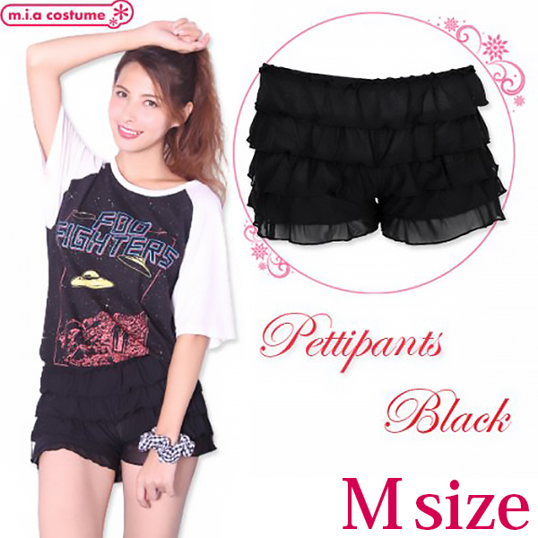 カラーが透けにくいブラック(黒)のペチコートパンツです。コスチュームの下や制服の下等、ミニスカートの内側に見えても安心♪低価格なのに高品質でやわらかい素材だからはき心地も抜群!フリルのデザインも可愛いから何枚も欲しくなりますね♪オールシーズンに使えて便利!おしゃれですっきり見えるので冬の汗対策や部屋着にもどうぞ。※弱い手洗い可、塩素系漂白剤による漂白不可、アイロン不可、日陰のつり干しが良い、洗濯機で洗濯をされる場合はネットに入れてください。