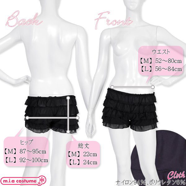 仕様:Mサイズ W52〜80cm・H87〜95cm・総丈22cm セット内容:ペチコートパンツ単品(ウエストゴム) 素材:ナイロン94%、ポリウレタン6% モデル身長162cm