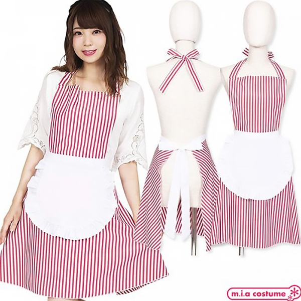 細めのストライプ柄が印象的で、とっても大人かわいいエプロンです。ウエストの白いフリルエプロンは一体型になっていて、首と腰でリボン結びするタイプだから体型にあわせてサイズの調整が可能です♪キッチンだけでなく、お料理教室やプレゼントとして、ホームパーティーなどにも!アメリカンダイナーやウェイトレス風にもコーディネート出来るので、学園祭、カフェイベントでの使用にもおすすめです!※洗濯機不可、弱い手洗い可、塩素系漂白剤による漂白不可、アイロンは中温で当て布使用、ドライクリーニング不可