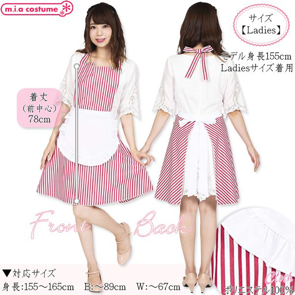 仕様:対応サイズ:身長155〜165cm・B〜89cm・W〜67cm 実寸:着丈78cm(前中心) セット内容:エプロン単品(首リボン、腰リボン) 素材:ポリエステル100%