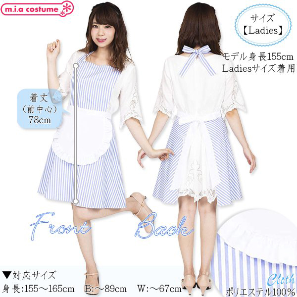 仕様:対応サイズ:身長155〜165cm・B〜89cm・W〜67cm 実寸:着丈78cm(前中心) セット内容:エプロン単品(首リボン、腰リボン) 素材:ポリエステル100%