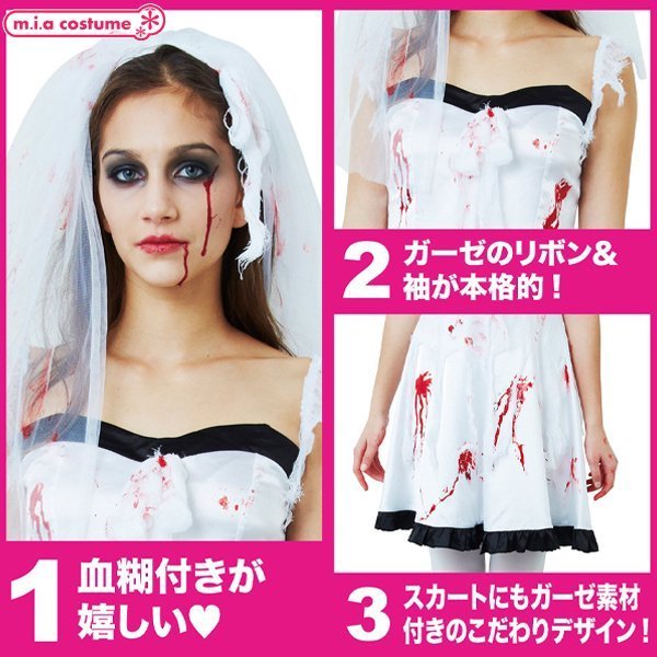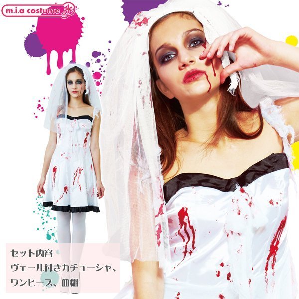 仕様:フリーサイズ:身長155〜165cm・B74〜92cm・W72cm・着丈65cm(ストラップ含まず) セット内容:ヴェール付きカチューシャ、ワンピース(裏地無し、背中心ファスナー)、血糊 素材:ポリエステル100%