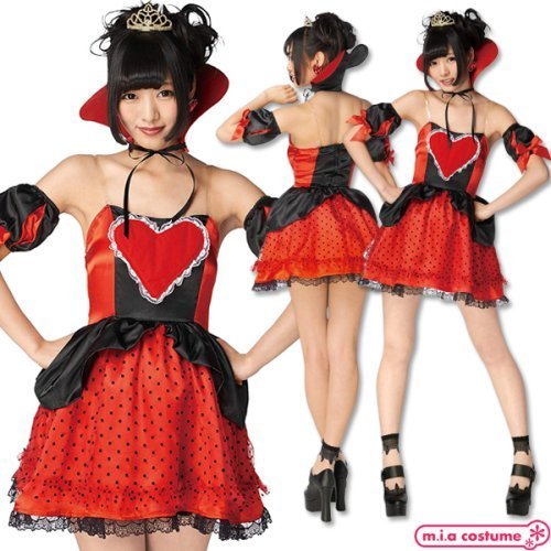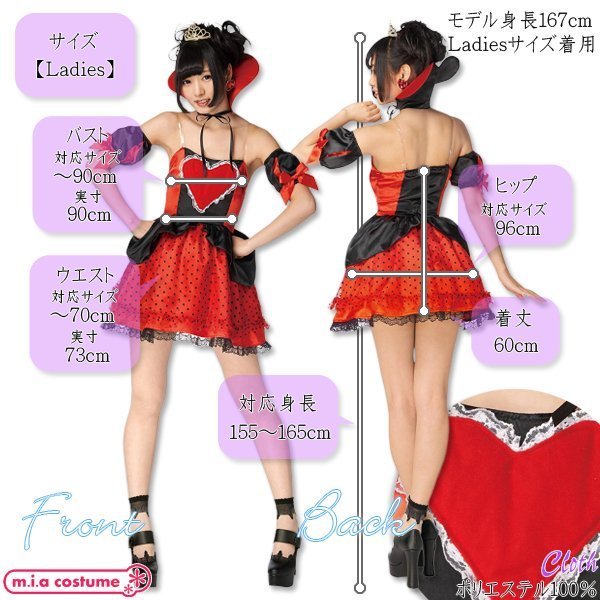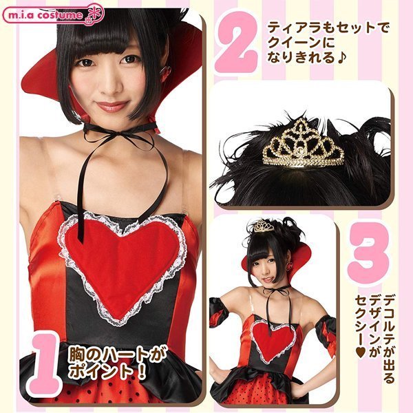 ハロウィン仮装やパーティーなどで大活躍♪胸元の大きなハートがポイントのコスプレ衣装です。充実のセット内容でワンピースにティアラ、付け袖、付け襟がセットとなっていて、付け襟もハート型のこだわりデザインが良い感じ♪ティアラもセットになっているのでこの1セットさえあれば本格的な仮装が楽しめます!※水洗い不可、塩素系漂白剤による漂白不可、アイロンは低温で当て布使用、ドライクリーニング不可、色落ちの可能性があります。※こちらの商品は在庫の状況によりお届けまでに4日〜7日程度かかる場合がございます。
