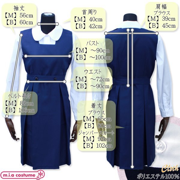 仕様:Mサイズ:B〜90cm・W〜72cm・ブラウス着丈65cm・ジャンパースカート丈92cm・袖丈56cm・肩幅39cm・首周り40cm・ベルト88cm セット内容:ブラウス(前ボタン)、ジャンバースカート(裏地有り・脇と肩スナップボタン留め)、ベルト 素材:ポリエステル100%
