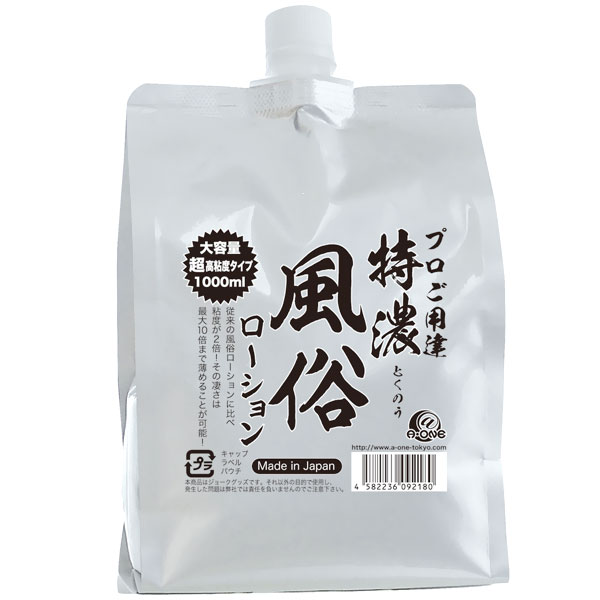 大容量1リットル!風俗店御用達「風俗ローション」に超高粘度の特濃バージョンが登場。従来の「風俗ローション」に比べ、粘度が約2倍!使用時に水やお湯で薄めれば、最大10倍の容量になるのでとっても経済的!ソープごっこやマッサージなどの本格的なローションプレイをご自宅で楽しめます!プロ納得の高品質ローションです。