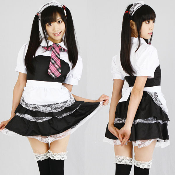 丸襟にピンク色のチェック柄チョーカーリボンが可愛いメイド服コスプレ。ワンピースのフリルと、エプロン&カチューシャにあしらわれたレースフリルで、より女の子らしさをプラス!甘めな印象を与えるメイド服コスチュームです。※靴下は付属しません。サイズはおおよその目安となります、表記のサイズを基準に前後でお考え下さい。