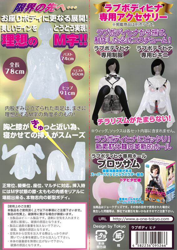 お座りポーズがさらに進化!理想のM字スタイルを実現した、エアーダッチワイフ「LOVE BODY hina(ラブボディ ヒナ)」。内股気味の両足は、まさに理想とするM字の角度そのもの!正常位や騎乗位、座位など、体位もマルチに対応可能!胸と膝の位置が近いので、寝かせた状態での挿入もスムーズです。その造形美は、もはや芸術の域と言っても過言ではないラブボディシリーズ!別売りのヒナ専用オナホールをセットして、膝や太もものリアルな感触をぜひ体感してください。※LOVE BODY hina専用ホール「ブロッサム(e09838)」は付属しておりません。※LOVE BODY hina専用「ビキニ(e09837)」「オリジナル制服(e09836)」「ブラジャー型つけぱい(e20364)」はこちら!