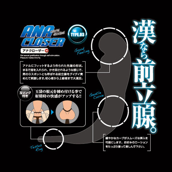 漢なら黙って前立腺マッサージ!前立腺刺激に特化したソフト素材のアナルグッズ「アナクローザー TYPE.03」。ボディの緩やかなカーブで挿入をサポート!先端はアナルにフィットするよう作られており、まるで指でかき回されるような感覚を味わえます!リング状の持ち手部分は、射精時の快感をより高める玉掛けリングとしてもお使い頂けます。