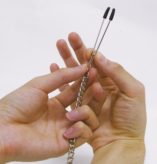 甘い痛みが癖になる!乳首クリップを重みのあるチェーンで繋いだSMグッズ。リングの位置をずらして、挟む強さを微調整できるニップルクリップに、U字に垂れ下がる長めのチェーンをつけました。動くたびに重力が働いて、乳首を下へと引っ張ります。軽く疼くような痛みが、知らぬ間に快感に…!先端をラバーで保護した、安全に使用できるSMグッズです。