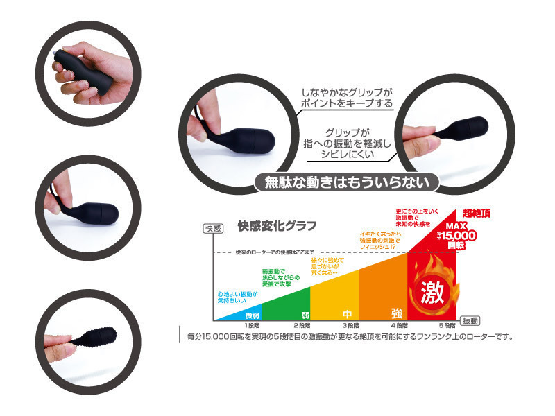 毎分15000回転が生み出す激しい絶頂感!最上級即逝きモード『激』搭載シングルローター。微弱から、ボタン送りで5段階の振動調節が可能!強の上を行く強烈バイブレーションが楽しめる有線リモコンローターです。振動で痺れにくいツマミグリップが使いやすい!マットなシリコン素材の柔軟性を生かして、当てたい場所を楽に刺激できます。単四電池2個付き。