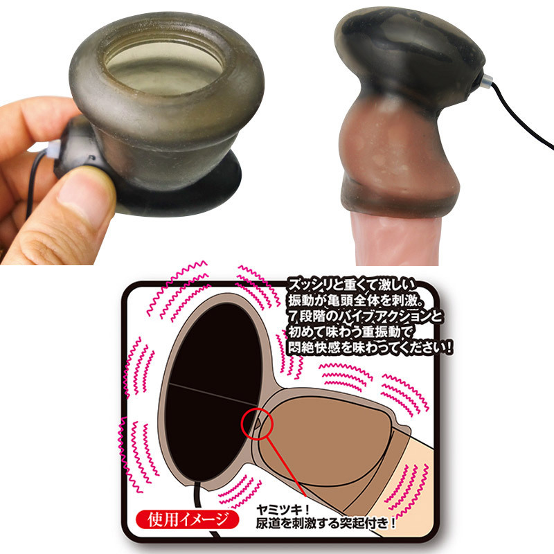 ズッシリ響く重振動!発売以来、大ヒットを記録している亀頭オナニーグッズ「ブラックロック」シリーズから、より先端刺激に特化した第4弾が登場。ローター装着部を亀頭先端に角度をつけて配置し、ダイレクトな超強力振動を実現!また、内部に尿道を刺激する突起を付けたことで、さらに刺激的になりました。伸縮性のあるキャップはカリ首でガッチリ固定できる特殊形状!7種の振動アクションを搭載したローターは、前作同様に着脱可能です。単3電池×2本使用。