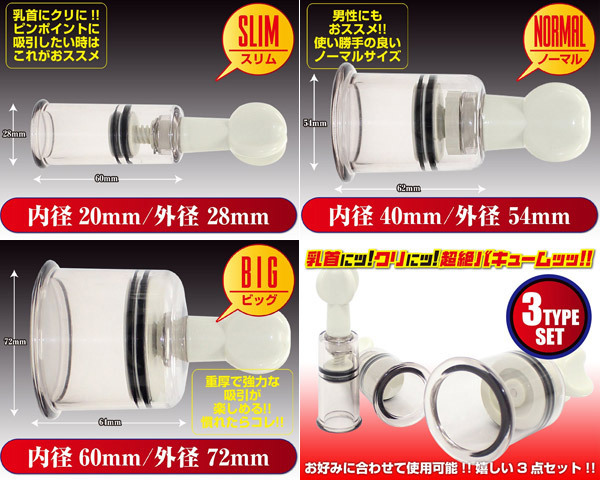 色んな「突起」で楽しんで♪男女で兼用できる便利な吸引グッズセット。●乳首やクリトリスに使える吸引具●それぞれ異なる三種サイズセット●底部を押し当てつまみを右に回す●内部が真空状態になり強力に吸引●内径:スリム20mm、ノーマル40mm、ビッグ60mm。乳首マニアな方も、チクニーに目覚めた方も、クリトリスを責めまくりたい方も!3サイズセットで男女問わずに突起をイジくり倒せちゃう吸引グッズ。乳首とクリの同時責めや二人仲良く吸引しあいっこなどプレイの幅も広がりそうですね。