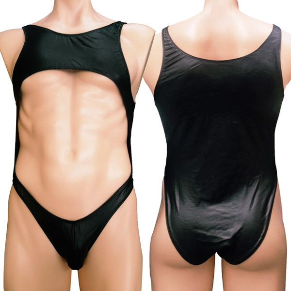 こんなデザイン見たことない!水着みたいな雰囲気も漂うメンズランジェリー。●スクール水着風のメインボディ●フロントを大胆に大きくカット●胸の下〜ヘソ下まで露わな状態●深い足ぐりのハイレグデザイン●後ろはカットなしハーフバック。レオタード?スクール水着?マンキニ?どこにも当てはまらない斬新デザインが視線を吸い寄せる男性用のセクシー下着。半分以上をオープンさせた過激なフロントと、平然を装うシンプルなバックスタイルとのギャップにも注目です。