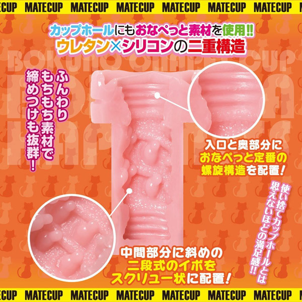 ふんわりモチモチな人気素材を使用!手軽に楽しめる使い捨てオナカップホール「ボクのおなぺっとSweetie」。メイトのおなぺっと素材×ウレタンスポンジの二重構造!入口と奥にはおなぺっと定番の螺旋構造を配置!さらに中間部に斜めの二段イボをスクリュー状に配置。カップの底面側に15mlのボトルローションが別途入っているので、乾くこともなくお好みの量で楽しめます。使い捨てるのはもったいない?簡易ホールとは思えないほどの満足感を得られるオナカップ!もっちりおなぺっと素材で締めつけも抜群です。