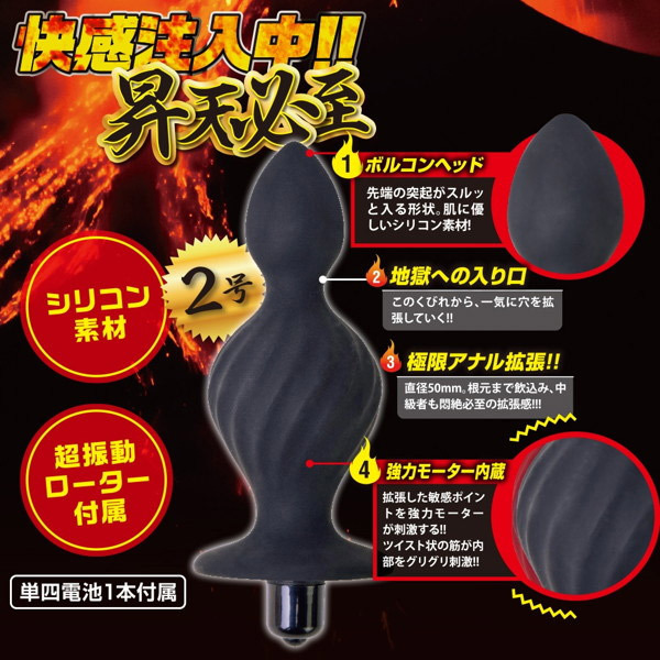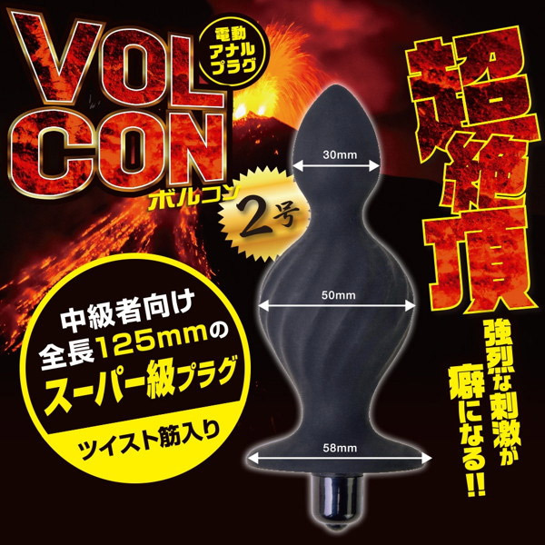 昇天必至の超強力ローター搭載!強烈な刺激が癖になる電動アナルプラグ「ボルコン2号」。二段の膨らみを持つくびれボディはシリコン素材で滑らかな肌触り!表面にはツイスト筋を入れて刺激をプラス。スルッと入る先端ボルコンヘッドの先にあるくびれを超えると、二つ目の大きな膨らみが腸内をみっちり満たします。さらに、拡張した敏感ポイントに強力振動ローターが刺激を与える悶絶必至のアナル拡張グッズ。中級〜上級者向けサイズの2号は全長12.5cm、最大径5cmとスーパー級の極太仕様です。単四電池×1本付属。