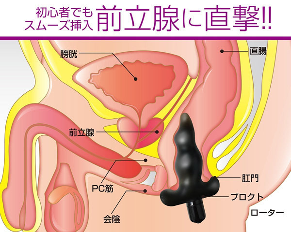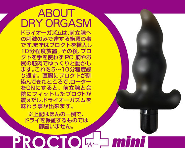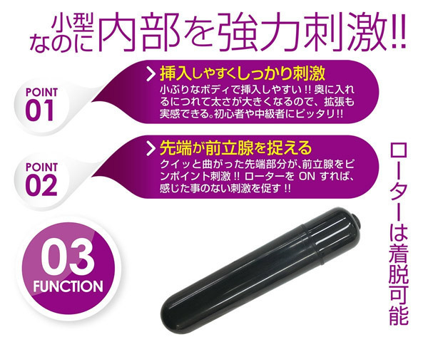 小ぶりでも超パワフル!挿入しやすいミニタイプの電動エネマグラ「プロクトミニ ジェット」。アナルプラグのようなストッパー付きの本体は先端が前立腺をしっかり捉えるジャスト形状!クビレ部分が抜け落ちを防ぎつつ、クイッと曲がった先端部分が前立腺に直撃!ピンポイントでしっかり捉えて内部を強力に刺激します。根元にいくにつれて太くなるフォルムは拡張も実感できるので初心者や中級者にもピッタリ。さらに、3ファンクション搭載の内蔵ローターONで悶絶刺激も味わえます。ローターは着脱可能!単四電池×1本付属。電池を入れる際、中の絶縁体シートは外さないでください。