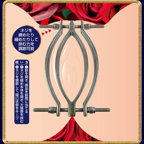 大陰唇を開いて挟んでそのまま固定!!究極の羞恥プレイが楽しめるSMグッズが登場!!開いたあそこを眺めたり、じっくり責めたり、そのまま放置したり…使い方はあなた次第。オンナのまん肉をつまんで、開口状態をキープせよ!!<使い方>@股を開きプッシークランプを股間に当てるAネジを緩め本体を開き大陰唇を挟むBネジを調整すれば開口状態をキープ※】無理のない範囲でご使用ください。商品特性をご理解のうえ自己責任でお楽しみください。