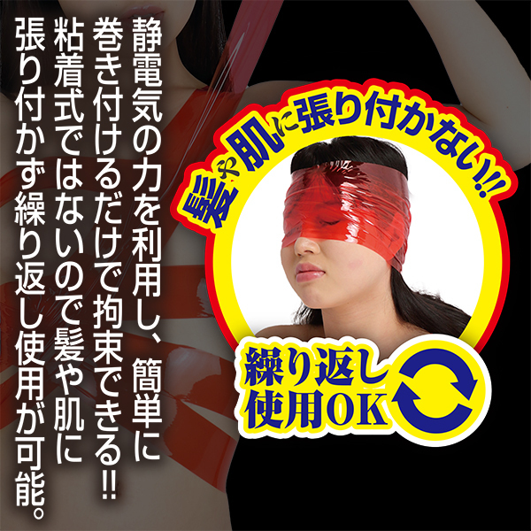 体中どこにでも使用OK!魔法のように吸着できるSMプレイ用拘束テープ。●人気の拘束具「SMart」シリーズ●扱いやすい5cm幅の赤色テープ●全身に惜しまず使える長さ15m●静電気の力による優しい密着感●粘着素材不使用なので再利用OK。普段の生活でもなじみ深い食品用ラップフィルムのように、ピタッと静電気で密着できる拘束テープ。ベタベタしないので髪の毛や顔、アンダーヘアにも利用OK!座らせた椅子ごとグルグル…なんていうプレイもできちゃいます。