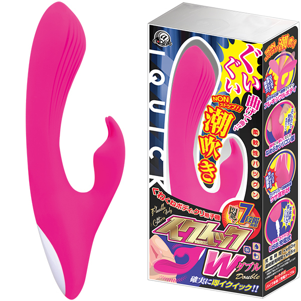 Gスポを的確に捉えるミドルサイズのバイブ「イクイックW(ダブル)」。ぐいぐい自由に曲げられるフレキシブルボディにクリを挟むことができるクリ用子機も付いた贅沢仕様のバイブです♪持ち手のグリップが短いのでハンドリングしやすく、挿入部分を自在に曲げられるフレキシブルシャフトが特徴となっています。膣内にも優しくなじむシリコン製で肌触りはソフトでなめらか♪子バイブは先端のバイブと連携しているので強弱含んだ7パターンの振動が楽しめます。使用後も洗えて清潔で安心!Gスポットを刺激しながらクリトリスも刺激するなどノンストップでの潮吹きも楽しめちゃいます♪優しさと激しさと心強さを兼ね備えた潮吹きバイブ!生活防水仕様なので丸洗いできて衛生面でも安心です♪電源はUSB充電式でフル充電60分で連続使用約55分。