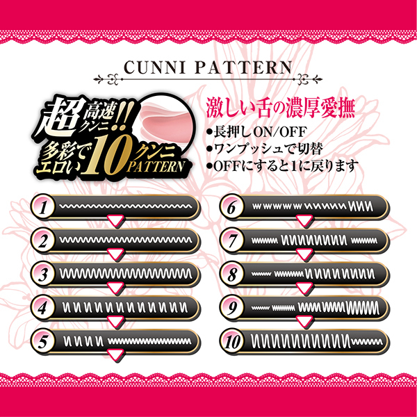 激しい愛撫で乱れちゃう。下品で卑猥なお手軽クンニローター!超高速で動く、むっちりリアルな肉厚舌。舌部分はエラストマー製のむっちりな触り心地。超柔らか素材だから強く押し当てても大丈夫。クリにも乳首にも、柔らかいから中にも使えます。使い方はプレイに集中できるワンボタンで、USB充電式。防水仕様だから、使用後も洗えて清潔で安心。激しく濃厚なクンニは全部で10パターン。焦らず、リズムよく、激しく、そして優しく…。日常のすべてを忘れ、ぐっしょりとクンニ時間に溺れてください。充電時間:約120分連続使用時間:約60分(使用状況や環境により時間が変わる場合があります)。・10パターンアクション・USB充電・防水仕様