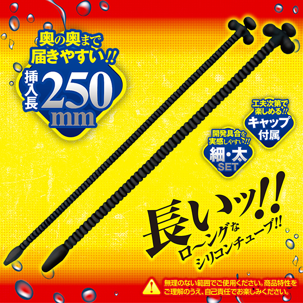 U−プラグシリーズに、ロングな奴らが登場。とにかく長い!ロン〜グなシリコンチューブ。長いから奥の奥まで届きやすい!!開発具合を実感しやすい太さの異なる2本セット。工夫次第で楽しめるキャップも付属。シリコン製だから柔軟性もバツグン。中が空洞なので、汚れてもサッと洗い流せて、使い方もいろいろ!