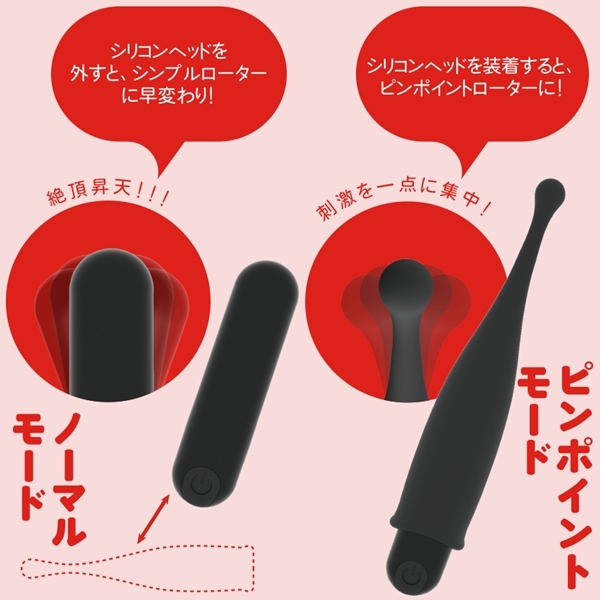 初心者でも扱いやすいピンポイントローターです♪ヘッド部分には肌触りの良いシリコン素材を使用し、小型ながらもパワフルな刺激をお届けします!狙ったポイントを的確に刺激できるピンポイントモードと、シリコンヘッドを外して使用するノーマルモードの2WAY仕様♪ワンボタンで簡単に操作でき、10種類の振動パターンからお好みの刺激を選べます!IPX7等級の完全防水なので、お風呂などでも使用可能です♪