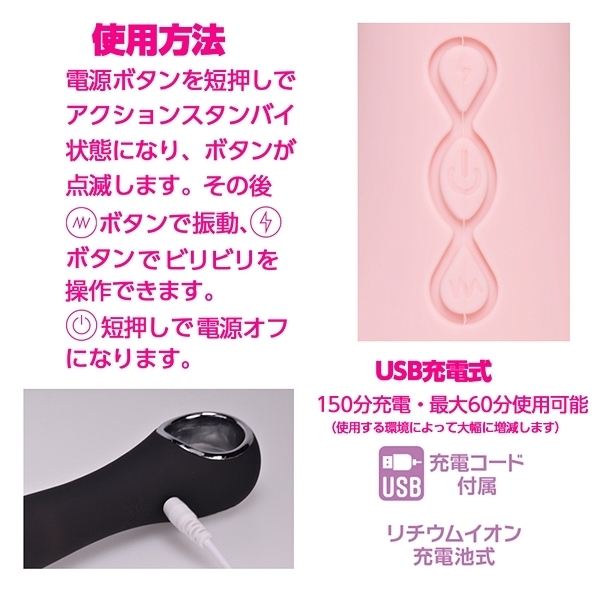 ビリビリ低周波が刺激的な話題の膣トレバイブ、心地良いビリビリに強力な振動で他では味わえない快感を楽しめます。シンプルなストレート形状に肌心地の良い高品質マットシリコンで滑らかな感触。IPX7の完全防水性能だからしっかり洗えて衛生的に遊んで頂けます。振動・ビリビリ刺激は個別に操作が可能で、ビリビリ7パターン。振動12パターン。150分充電で最大60分使用可能(使用環境によって大幅に増減します)●カラー:ブラック